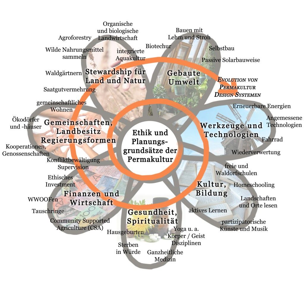 In der Permakultur-Systemblume (s. unten) nach David Holmgren sind beispielhaft die Themengebiete dargestellt, mit denen ich mich beschäftigt habe. Dabei ist sicher erkennbar, dass ich in sehr vielen Gebieten in unterschiedlichsten Funktionen tätig war oder bin.